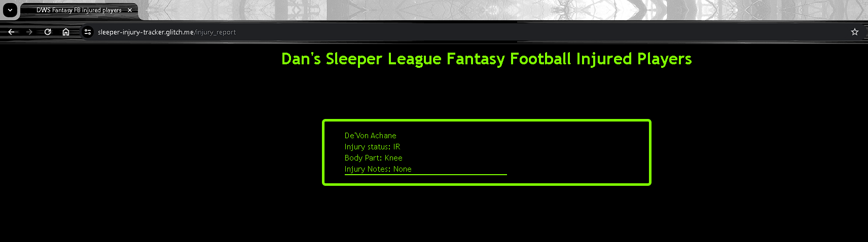 One of my side projects is a Fantasy Football Injury Tracker, which I've partially completed. This project serves as a platform for me to enhance my Python skills while working with APIs and data. It leverages the Sleeper NFL fantasy football's open API to fetch data about my team's players and compiles a list of those who are currently injured.