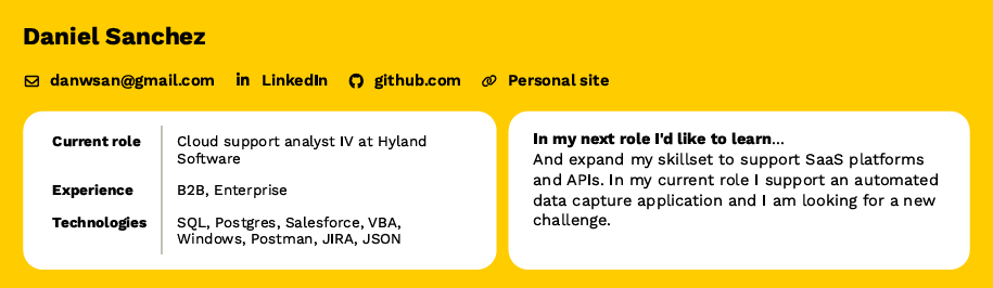 I'm a Cloud Support Analyst IV at Hyland Software, with 10 years of experience in B2B and Enterprise solutions. My proficiency spans SQL, Postgres, VBScript, Windows, Postman, Salesforce, JIRA, and JSON, coupled with a knack for troubleshooting and adept log analysis. In my current role, I support automated data capture software, but I'm driven to expand my skill set to include SaaS platforms and APIs.